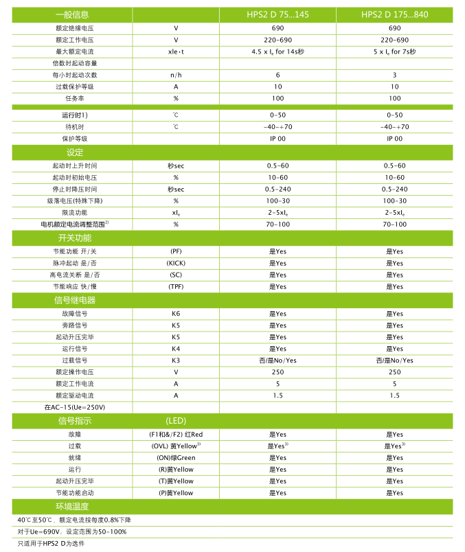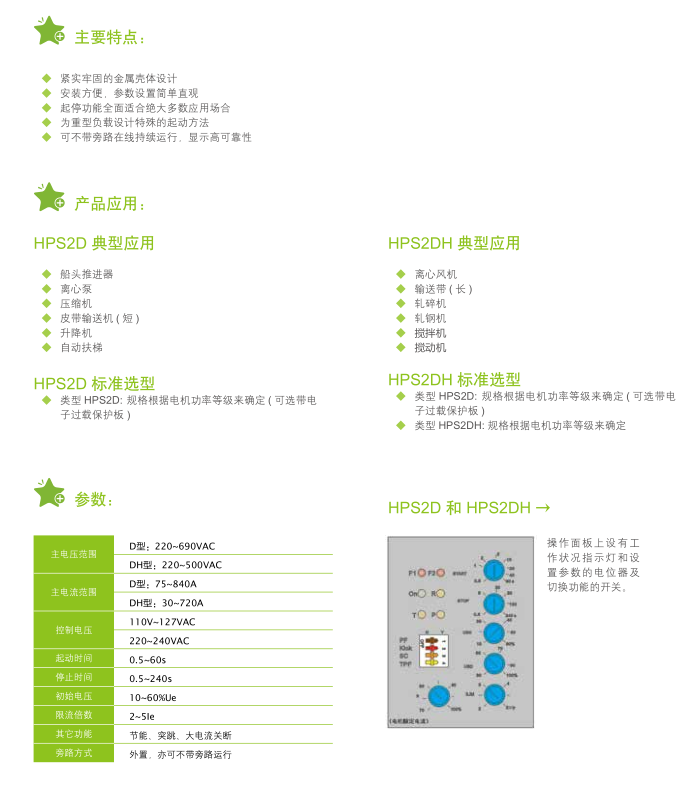 HPS2D75...840HPS2DH30...720 軟起動器均有著堅固的金屬殼體設計,可分別適用于常規負載和重型負載的各種應用場合它結構牢固緊湊,安裝方便快捷。所有參數和功能選項均通過前面板上的調節電位器和功能切換開關來設定和選擇。直觀清晰,各工作階段和狀態及故障均有相應LED 指示讓用戶一目了然。特設節能功能,當電機運行在空載或輕載時自動降低負載電壓,