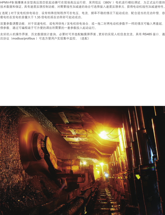 HPMV-FB系列礦用隔爆兼本質安全型高壓交流軟起動器具有多種起動方式、控制功能和完善的電機綜合保護功能。消除了機械及電流沖擊,延長了設備使用壽命,提高礦用設備的穩定性、安全性。主要適用于煤礦礦井下和其他周圍介質中含有甲烷及煤塵混合物的爆炸性氣體及條件惡劣的特殊環境中。